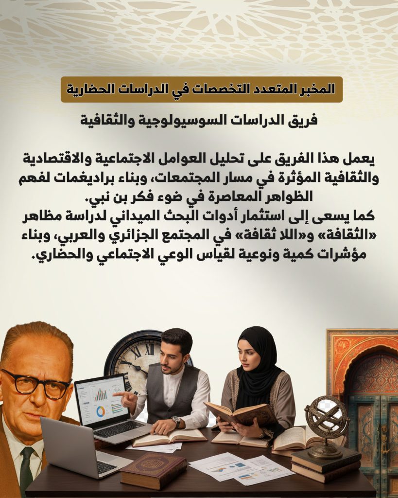 في هذا الإطار، تم إنشاء فرقة الدراسات السوسيولوجية والثقافية ضمن مخبر/كرسي «مالك بن نبي للدراسات الحضارية». وتشمل مهامها الأساسية: