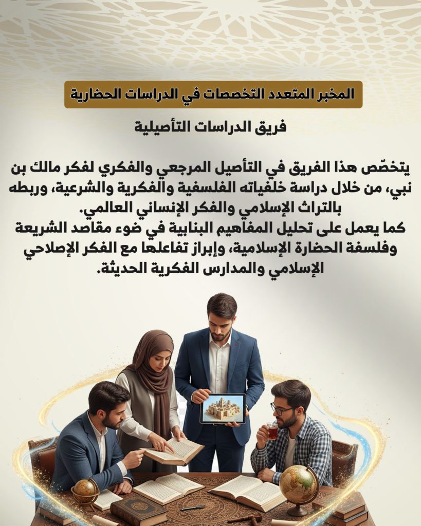 الرئيسية/فرقة الدراسات التأصيلية فرقة الدراسات التأصيلية وذلك عبر التأكد من أن كل عملية ترجمة أو توثيق أو مراجعة تتم في ضوء الأطر المرجعية الإسلامية والفكرية الأصيلة، بما يحفظ لفكر مالك بن نبي عمقه الحضاري ويمنع أي تشويه أو تحريف في مضامينه. قراءة المزيد